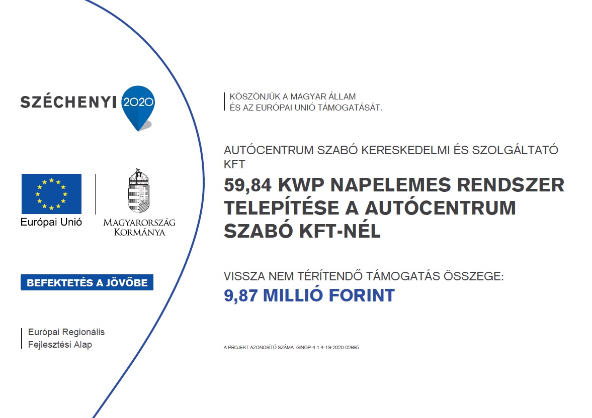 • A projekt címe: 59,63 kWp napelemes rendszer telepítése a AUTÓCENTRUM Szabó Kft-nél